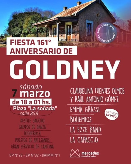 Fiesta 161° ANIVERSARIO DE GOLDNEY, en la Plaza La Soñada para disfrutar de una jornada de música en vivo, servicio de cantina, desfile gaucho y mucho más.