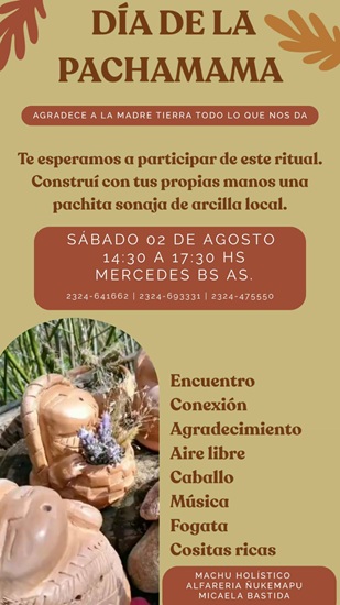 MaChu Holístico te invita a celebrar a la Pachamama con un ritual especial de conexión, agradecimiento y encuentro con la Madre Tierra compartiendo una tarde al aire libre, donde vas a poder crear con tus propias manos una pachita sonaja de arcilla local, disfrutar de música, fogata, caballos y ricas cositas para compartir.