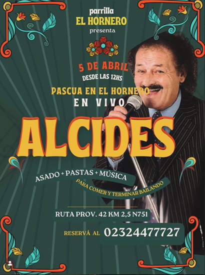 ALCIDES, una voz que marcó generaciones… Viví una Pascua distinta con su show en vivo, asado, pastas y la mejor música. Un encuentro para cantar, recordar y disfrutar.