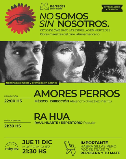 En esta oportunidad se proyectará el film AMORES PERROS, nominado al Oscar y premiado en Cannes y la actuación en vivo de RA HUA con repertorio especial de rock latinoamericano.