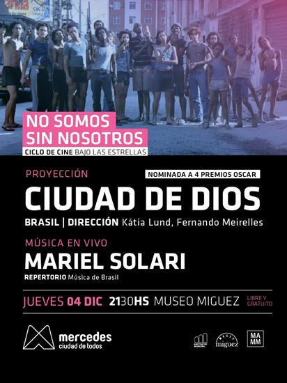 En esta oportunidad se proyectará el film CIUDAD DE DIOS, nominado a 4 premios Oscar y la actuación en vivo de MARIEL SOLARI con repertorio especial de música de Brasil.