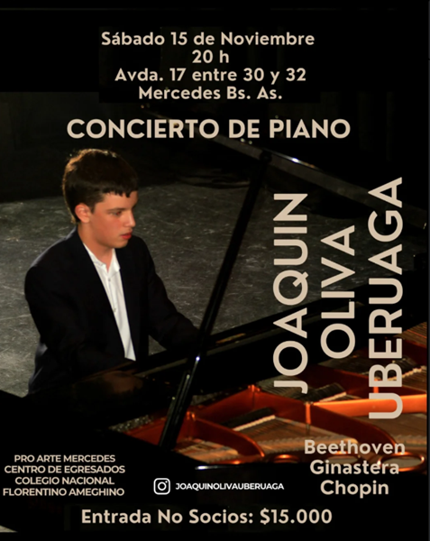 CONCIERTO DE PIANO con interpretación de JOAQUIN OLIVA UBERUAGA, interpretando obras de Beethoven, Ginastera y Chopin.