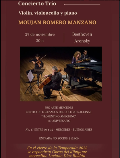 CONCIERTO TRIO, violín, violoncello y piano con Moujan, Romero y Manzano, interpretando obras de Beethoven y Arenski.