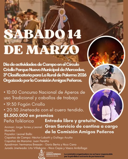 Habrá concurso y jineteada y, durante el día, la cantina acompañará el encuentro. Al caer la tarde, habrá fogón criollo, música y peña folklórica para seguir compartiendo entre amigos y en familia.