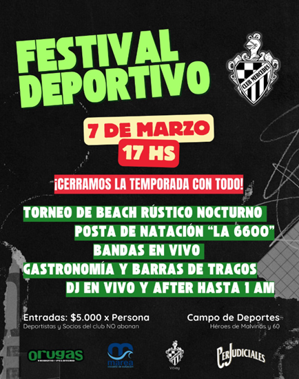 FESTIVAL DEPORTIVO, cierre de temporada con todo… torneos de Beach Voley, posta de natación «La 6600», bandas en vivo y mucho más.