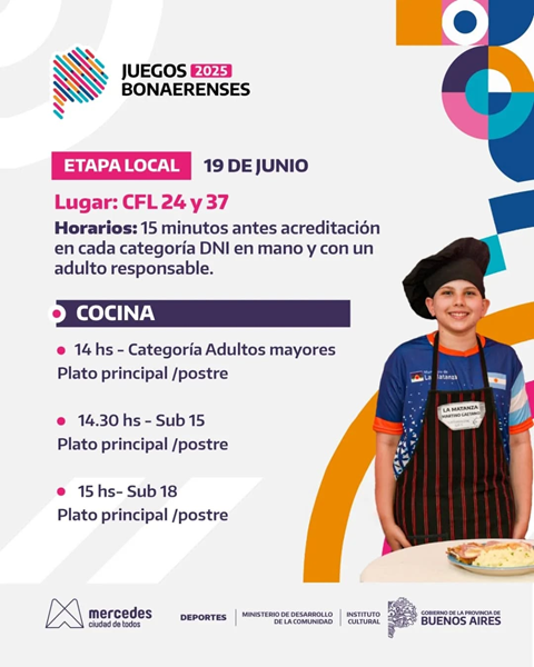 Comienza la Etapa Local de los JUEGOS BONAERENSES 2025 en la disciplina Cocina de las categorías Adultos Mayores, Sub 15 y Sub 18.
