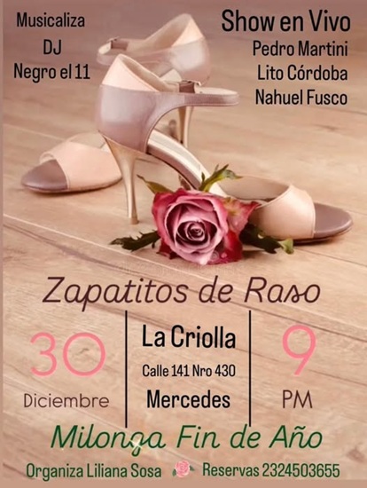 MILONGA ZAPATITOS DE RASO, despuntá el vicio, bailate unos buenos tangos y disfrutá de un show en vivo especial para despedir el año: PEDRO MARTINI, LITO CORDOBA y NAHUEL FUSCO.