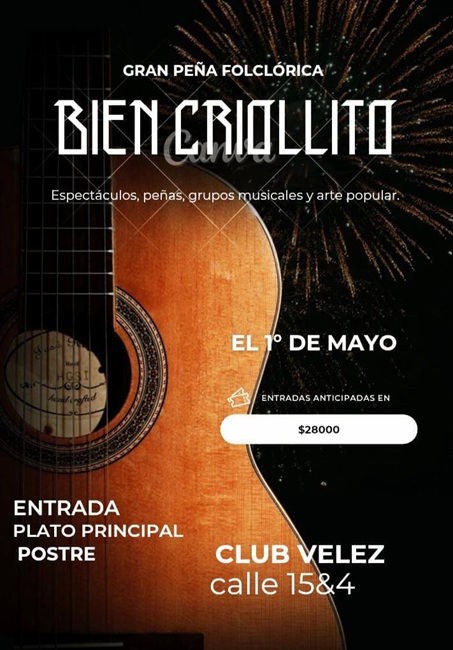 Gran peña folklórica BIEN CRIOLLITO, cena show con espectáculo, grupos musicales y Dj hasta las 5:00 hs.