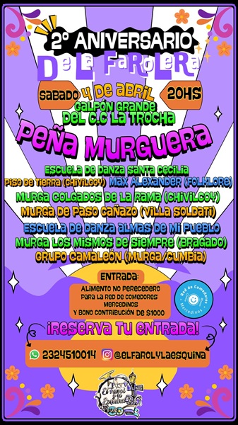 PEÑA MURGUERA, celebrando el 2° Aniversario de la murga El Farol y la Esquina, con la participación de escuelas de danza, folklore, murgas y cumbia/murga. ¡Una noche de música, folklore, murga y tradición!