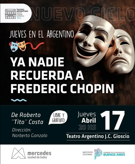 YA NADIE RECUERDA A FRÉDÉRIC CHOPIN, un viaje por la honda espesura de la memoria, hacia a un 17 de octubre que se repite en añoranzas y ausencias. El gran dramaturgo Tito Cossa invita a recorrer la magia, que confunde y borra los límites entre realidad y fantasía, mientras suenan en el piano acordes de nocturnos y polonesas.