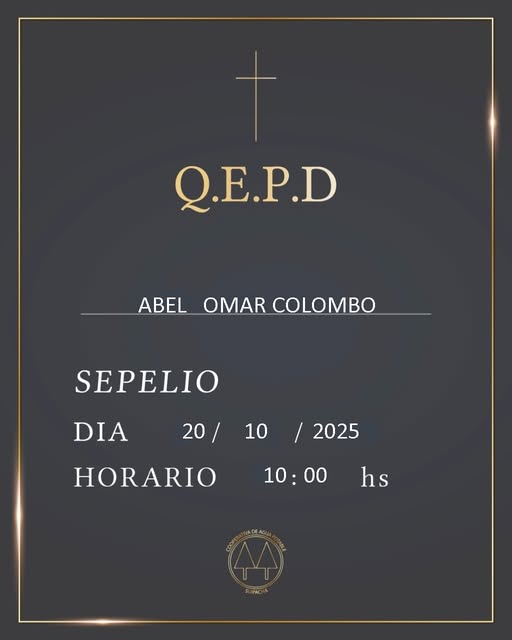 InicioSociedadObituarios Obituarios ABEL OMAR COLOMBO Q.E.P.D. By datoposta 19 octubre, 2025 0 828 FacebookTwitterPinterestWhatsApp Falleció el día 19 de octubre de 2025 Sepelio: Lunes 20, a las 10 horas Suipacha🔎 Te puede interesarEDUARDO RAUL LOZA MONTAÑA Q.E.P.D.junio 2025ELBA HAYDEE FLORELLA (PELUSA) Q.E.P.D.septiembre 2025SARA HAYDEE SANTANA Q.E.P.D.noviembre 2024 Comparte esto: Haz clic para compartir en Facebook (Se abre en una ventana nueva) Facebook Haz clic para compartir en X (Se abre en una ventana nueva) X Me gusta esto:Me gusta Cargando... TagsABEL OMAR COLOMBO Q.E.P.D. Cuota FacebookTwitterPinterestWhatsApp Artículo anteriorGOBIERNO ENVIÓ FUNCIONARIOS AL CARIBE A EVENTO IRRELEVANTE Y GASTOS COSTOSOSArtículo siguienteVÉLEZ LÍDER, TROCHA ESCOLTA Y QUILMES SE SUMA A LA PELEA datoposta Articulos relacionados Nacionales CORONAVIRUS: SIGUEN SUBIENDO LOS CASOS EN EL PAIS Nacionales EX ASESORA DE MILMAN DECLARÓ QUE BORRARON CONTENIDO DE SU TELÉFONO EN OFICINA DE BULLRICH Política MANCINI: «EL INTENDENTE DE SUIPACHA MIENTE Y ES UN VACUNADO VIP» Mas leidas Obituarios ABEL OMAR COLOMBO Q.E.P.D. Obituarios LIA VIRGINIA LUCHETTI Q.E.P.D. Obituarios LUIS ALBERTO CLARA Q.E.P.D. DEJA UNA RESPUESTA Cancelar respuesta Comentario: Por favor ingrese su comentario! Nombre:* Por favor ingrese su nombre aquí Correo electrónico:* ¡Has introducido una dirección de correo electrónico incorrecta! Por favor ingrese su dirección de correo electrónico aquí Sitio web: Guardar mi nombre, correo electrónico y sitio web en este navegador la próxima vez que comente. Δ Seguinos4,568FansMe gusta985SeguidoresSeguir512SeguidoresSeguir Ultimos articulos Deportes VÉLEZ LÍDER, TROCHA ESCOLTA Y QUILMES SE SUMA A LA PELEA Nacionales GOBIERNO ENVIÓ FUNCIONARIOS AL CARIBE A EVENTO IRRELEVANTE Y GASTOS COSTOSOS Nacionales DE PELÍCULA: EL ROBO DEL SIGLO EN EL LOUVRE EN SIETE MINUTOS Nacionales MORÓN: COMISARIO RETIRADO MATÓ A DOS ADOLESCENTES QUE INTENTARON ROBARLE Obituarios MABEL ELENA HERRERA VDA DE LERTORA Q.E.P.D. Cargar más