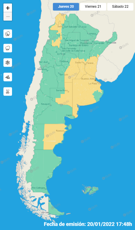Además, emitió un alerta naranja en localidad tales como Arrecifes – Baradero – Capitán Sarmiento – Exaltación de la Cruz – Pergamino – Ramallo – San Andrés de Giles – San Antonio Areco – San Nicolás – San Pedro y Zárate.