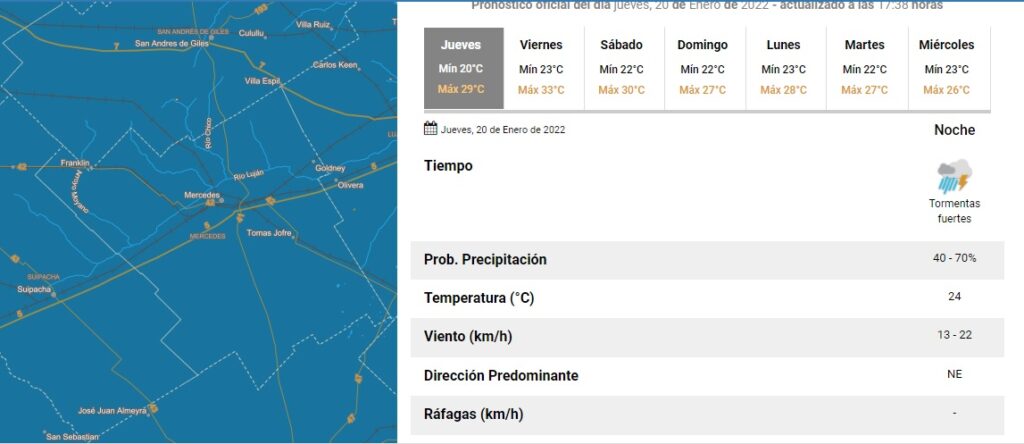 Tras el alerta durante la tarde de hoy jueves, el Servicio Meteorológico Nacional volvió a emitir un alerta amarillo sobre posibles tormentas durante la noche de hoy de diversas intensidades en Mercedes y la zona, alguna de ellas puede ser de fuerte intensidad, estar acompañada por ráfagas fuertes y con la ocasional caída de granizo. Por tal motivo, se eleva a ‘Amarillo’ el Nivel de Atención del Riesgo por tormentas fuertes con ráfagas».