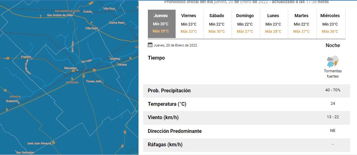 Además, emitió un alerta naranja en localidad tales como Arrecifes – Baradero – Capitán Sarmiento – Exaltación de la Cruz – Pergamino – Ramallo – San Andrés de Giles – San Antonio Areco – San Nicolás – San Pedro y Zárate.