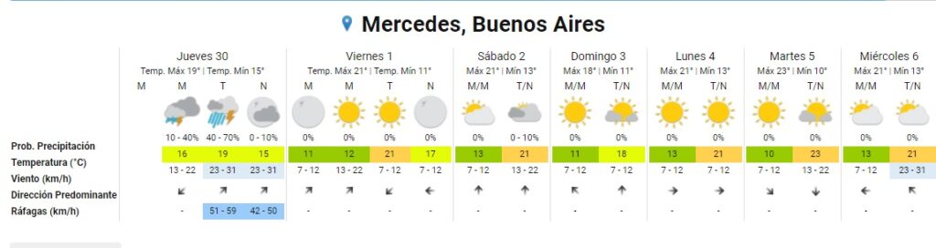 En Mercedes se esperan lluvias aisladas por la mañana, y una tormenta más abundante por la tarde, con el regreso del sol mañana viernes.