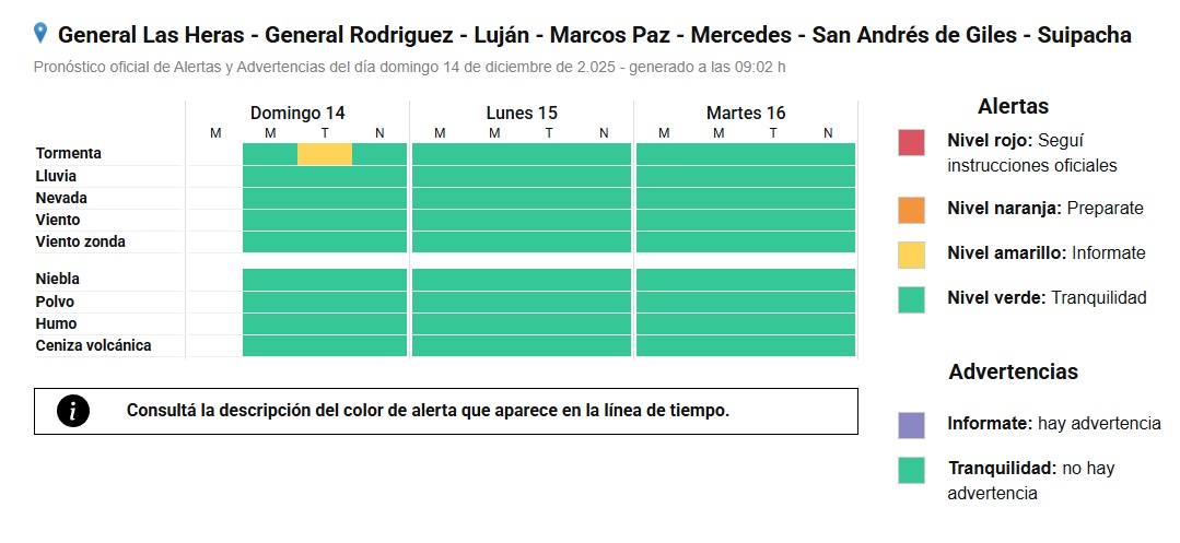 El alerta es para las localidades de Mercedes, Suipacha, San Andrés de Giles, Marcos Paz, Luján, General Rodríguez y Las Heras.