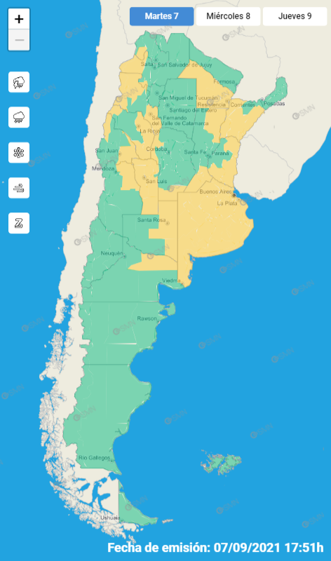 El Servicio Meteorológico Nacional lanzo un alerta amarillo para toda la provincia de Buenos Aires hasta el día jueves inclusive.