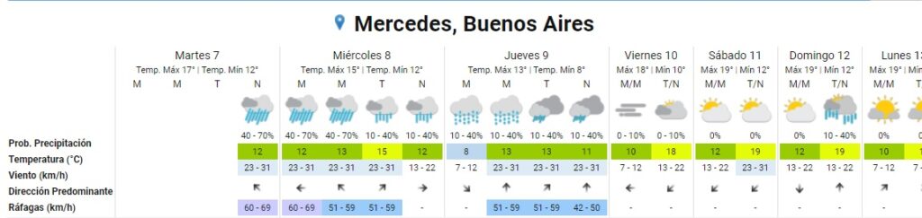 Según indica el Servicio Meteorológico Nacional, este martes 7, miércoles 8 y jueves 9 de septiembre se presentarán probabilidades de intensas lluvias y tormentas con ráfagas de viento fuertes, esperando un acumulado de entre 60 mm, pudiendo ser mayores en áreas específicas.