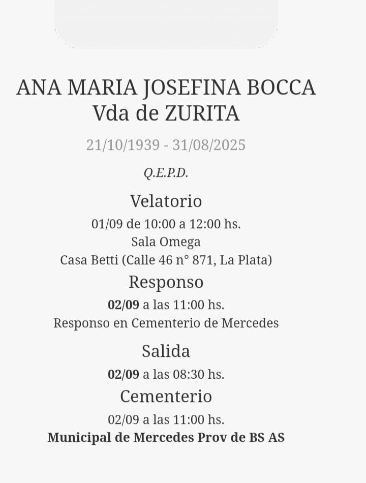 Sepelio: martes 2 de septiembre a las 11 horas, previo Responso en el Cementerio de Mercedes