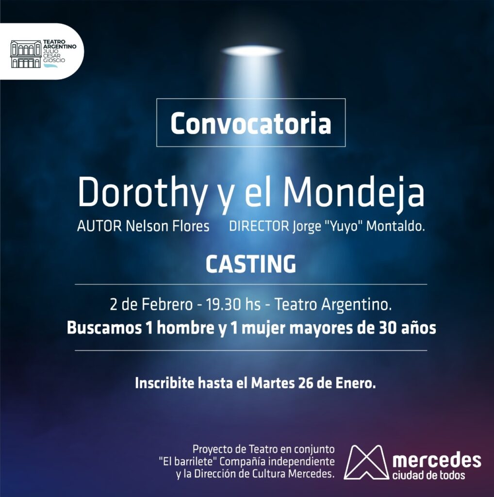 Desde la Dirección de Cultura de la Municipalidad de Mercedes se lanzó la convocatoria para participar de un casting, cuyos elegidos formarán parte de la obra «Dorothy y el Mondeja» de Nelson Flores, dirigida por Jorge «Yuyo» Montaldo.