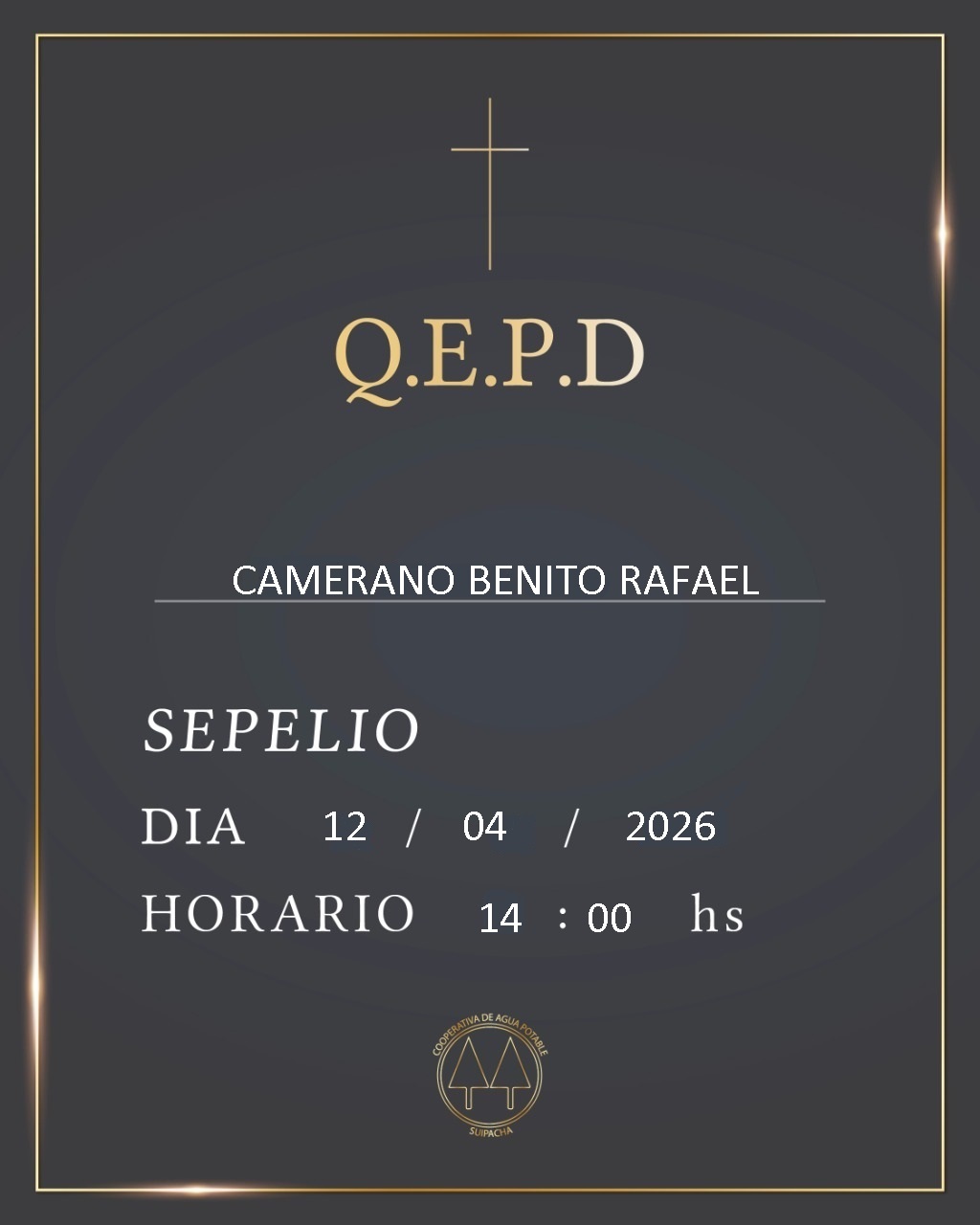 InicioSociedadObituarios Obituarios BENITO RAFAEL CAMERANO Q.E.P.D. By datoposta 12 abril, 2026 0 257 FacebookTwitterPinterestWhatsApp Falleció el día 12 de abril de 2026 Sepelio: domingo 12, a las 9 horas 100 años Suipacha Comparte esto: Comparte en Facebook (Se abre en una ventana nueva) Facebook Compartir en X (Se abre en una ventana nueva) X Me gusta esto:Me gusta Cargando... TagsBENITO RAFAEL CAMERANO Q.E.P.D. Cuota FacebookTwitterPinterestWhatsApp Artículo anteriorGIRO EN CASO «LA SALADA»: ORDENAN LA LIBERACIÓN DE LOS DUEÑOS datoposta Articulos relacionados Nacionales SENADO: INCIDENTES, REPRESIÓN Y QUEMA DE AUTO EN TRATAMIENTO DE LEY BASES Sociedad ALERTA AMARILLO POR TORMENTAS EN PROVINCIA: MERCEDES EXCEPTUADA POR POCO Sociedad LA COMUNIDAD EDUCATIVA DE LA ESCUELA NORMAL RECORRIO EL AVANCE DE OBRA Mas leidas Sociedad ROBOS DE BEBÉS EN MERCEDES: DESESPERADA BÚSQUEDA DE UNA MAMÁ A TRAVÉS DE LOS AÑOS Obituarios MIGUEL OSCAR OTTONELLI Q.E.P.D. Obituarios BENITO RAFAEL CAMERANO Q.E.P.D. DEJA UNA RESPUESTA Cancelar respuesta Comentario: Por favor ingrese su comentario! Nombre:* Por favor ingrese su nombre aquí Correo electrónico:* ¡Has introducido una dirección de correo electrónico incorrecta! Por favor ingrese su dirección de correo electrónico aquí Sitio web: Guardar mi nombre, correo electrónico y sitio web en este navegador la próxima vez que comente. Δ Seguinos4,568FansMe gusta985SeguidoresSeguir512SeguidoresSeguir Ultimos articulos Nacionales GIRO EN CASO «LA SALADA»: ORDENAN LA LIBERACIÓN DE LOS DUEÑOS Sociedad FIESTA DE LA TORTA FRITA: SÁBADO MULTITUDINARIO, PROMETE DOMINGO INOLVIDABLE Deportes CLUB MERCEDES GANÓ ANTE ARGENTINO DE ROSARIO EN UNA FECHA HISTÓRICA Curiosidades CURIOSIDADES DEL 12 DE ABRIL: DIA DE LOS NIÑOS DE LA CALLE Nacionales HOROSCOPO: COMO SERA SU SEMANA DEL 12 AL 18 DE ABRIL Cargar más