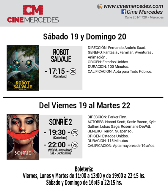 Esta es la cartelera del Cine Mercedes desde el viernes 18 al martes 22 de octubre.