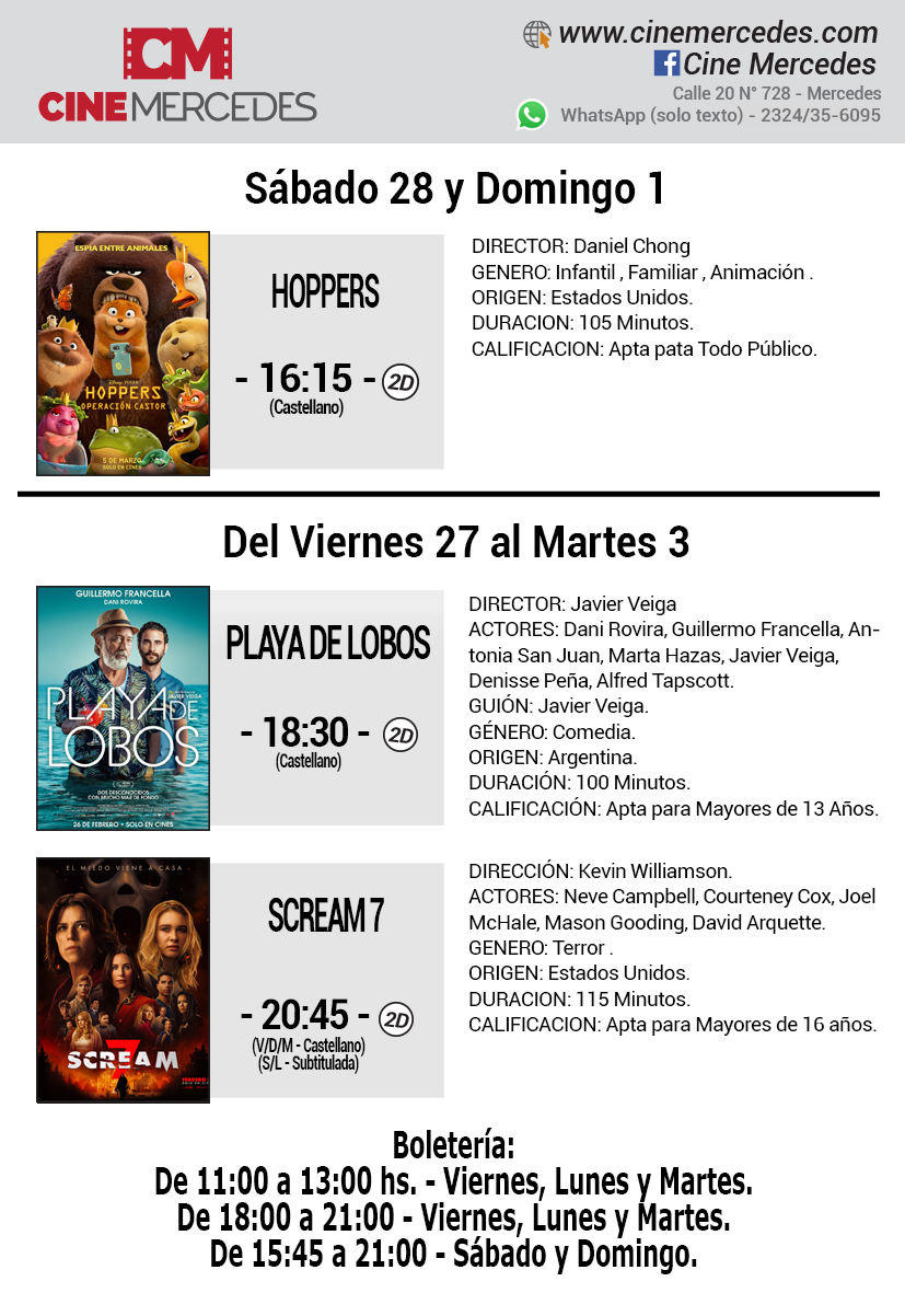Esta es la cartelera del Cine Mercedes desde el viernes 27 de febrero al martes 3 de marzo.