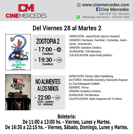 InicioCultura Cultura CINE MERCEDES: VIERNES 28 DE NOVIEMBRE AL MARTES 3 DE DICIEMBRE By datoposta 28 noviembre, 2025 0 121 FacebookTwitterPinterestWhatsApp Esta es la cartelera del Cine Mercedes desde el viernes 28 de noviembre al martes 3 de diciembre. ¿Querés saber más? http://www.cinemercedes.com/ Miércoles y jueves cerrado.🔎 Te puede interesarCINE MERCEDES: VIERNES 11 AL MARTES 15 DE JULIOjulio 2025PEDRO SABORIDO PRESENTA EN MERCEDES «UN VIAJE POR EL UNIVERSO BONAERENSE»agosto 2025JUAN VAIROLETO LLEGA AL CICLO DE LOS JUEVES EN EL ARGENTINOjulio 2025 «Zootopia 2» «No alimentes a los niños» Comparte esto: Haz clic para compartir en Facebook (Se abre en una ventana nueva) Facebook Haz clic para compartir en X (Se abre en una ventana nueva) X Me gusta esto:Me gusta Cargando... TagscarteleraCine MercedesinfantilesNo alimentes a los niñospelículasterrorZootopia Cuota FacebookTwitterPinterestWhatsApp Artículo anteriorLUZ Y GAS: SE VIENE UN 2026 CON SUBAS EN LAS TARIFAS datoposta Articulos relacionados Política ASAMBLEA AUTOCONVOCADOS LLAMA AL PARO Y MOVILIZACIÓN DE MAÑANA Sin categoría FARMACIAS DE TURNO EN MERCEDES Nacionales SMN: ALERTA AMARILLA POR LLUVIAS PARA MAÑANA Mas leidas Obituarios VALERIA NATALIA PEYRAT Q.E.P.D. Nacionales URGENTE: CAYÓ UNA AVIONETA EN CAMINO RURAL DE OLASCOAGA Obituarios JUAN MIGUEL CARRERE Q.E.P.D. DEJA UNA RESPUESTA Cancelar respuesta Comentario: Por favor ingrese su comentario! Nombre:* Por favor ingrese su nombre aquí Correo electrónico:* ¡Has introducido una dirección de correo electrónico incorrecta! Por favor ingrese su dirección de correo electrónico aquí Sitio web: Guardar mi nombre, correo electrónico y sitio web en este navegador la próxima vez que comente. Δ Seguinos4,568FansMe gusta985SeguidoresSeguir512SeguidoresSeguir Ultimos articulos Sociedad LUZ Y GAS: SE VIENE UN 2026 CON SUBAS EN LAS TARIFAS Curiosidades 28 DE NOVIEMBRE: CURIOSO DATO QUE CONECTA A CHESPIRITO Y SHAKESPEARE Deportes CRISIS ECONÓMICA: LA TIJERA Y GOWLAND SE BAJAN DEL TORNEO DE SEGUNDA Sociedad DESCUBREN SECRETO OCULTO DEL URBANISMO DE MERCEDES: LOS MASONES EN EL SIGLO XIX Nacionales URGENTE: CAYÓ UNA AVIONETA EN CAMINO RURAL DE OLASCOAGA Cargar más