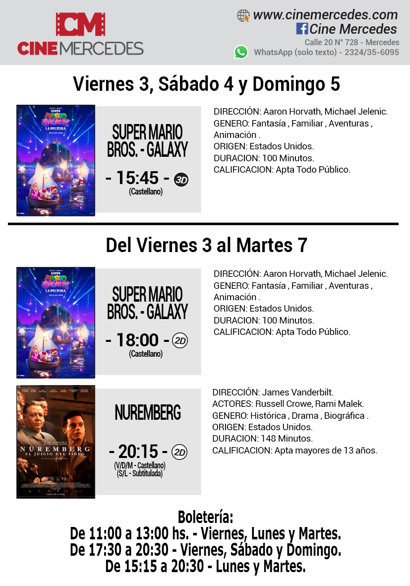 InicioCultura Cultura CINE MERCEDES: VIERNES 3 AL MARTES 7 DE ABRIL By datoposta 3 abril, 2026 0 137 FacebookTwitterPinterestWhatsApp Esta es la cartelera del Cine Mercedes desde el viernes 3 al martes 7 de abril. ¿Querés saber más? http://www.cinemercedes.com/ Miércoles y jueves cerrado. «SUPER MARIO GALAXY» «NUREMBERG: EL JUICIO DEL SIGLO» Comparte esto: Comparte en Facebook (Se abre en una ventana nueva) Facebook Compartir en X (Se abre en una ventana nueva) X Me gusta esto:Me gusta Cargando... TagsBelicacarteleracine infantilCine MercedesEl juicio del sigloGalaxyguerra mundialMario BrosNazisNurembergpelículasRussell Crowe Cuota FacebookTwitterPinterestWhatsApp Artículo anteriorNARCISO VICTORIO GUTIERREZ (NACHO) Q.E.P.D.Artículo siguienteMERCEDES LANZA LA «RUTA DE SABORES»: PROYECTO PARA POTENCIAR LA PRODUCCIÓN datoposta Articulos relacionados Nacionales LOS BANCOS VUELVEN AL HORARIO DE 10 A 15 HORAS Nacionales ALERTA EN PROVINCIA: MUERE NIÑA CON HANTAVIRUS Y ES EL CUARTO CASO EN POCOS DIAS Obituarios NADIA MENGUCCI DE TESSORE Q.E.P.D. Mas leidas Obituarios SUSANA INÉS COCARO Q.E.P.D. Nacionales TRAGEDIA EN RUTA 3: CINCO FALLECIDOS EN VIOLENTO CHOQUE FRONTAL Obituarios MARIA MERCEDES LAGIARD VDA DE GRASSO Q.E.P.D. DEJA UNA RESPUESTA Cancelar respuesta Comentario: Por favor ingrese su comentario! Nombre:* Por favor ingrese su nombre aquí Correo electrónico:* ¡Has introducido una dirección de correo electrónico incorrecta! Por favor ingrese su dirección de correo electrónico aquí Sitio web: Guardar mi nombre, correo electrónico y sitio web en este navegador la próxima vez que comente. Δ Seguinos4,568FansMe gusta985SeguidoresSeguir512SeguidoresSeguir Ultimos articulos Deportes «CAMBIANDO REALIDADES»: AMBICIOSO PROYECTO SOCIAL QUE LLEGA AL CLUB UNIÓN Cultura MERCEDES Y OTRO FIN DE SEMANA DEL «CAMINO DE LOS BODEGONES» Nacionales GOBIERNO NACIONAL ANUNCIÓ UN BONO PARA LAS FUERZAS DE SEGURIDAD Nacionales ALERTA POR ESTAFAS A AFILIADOS A IOMA: ADVIERTEN FALSAS LLAMADAS Y MENSAJES POR WHATSAPP Sociedad MERCEDES LANZA LA «RUTA DE SABORES»: PROYECTO PARA POTENCIAR LA PRODUCCIÓN Cargar más