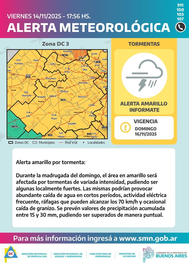 Mercedes y la región estará bajo alerta amarillo los días sábado y domingo, que si bien ya daban posibilidades de lluvias desde el comienzo de la semana, eran menores. A último momento, se intensificó en porcentaje de posibilidades, cantidad de agua y pasó de lluvias a tormenta.