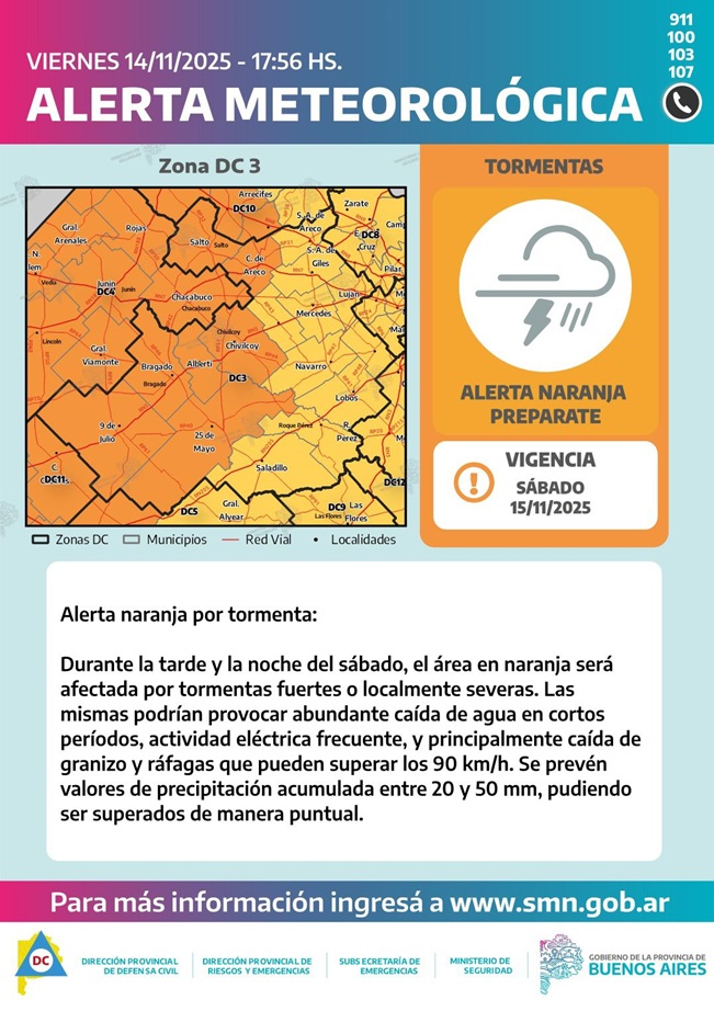 Para el sábado, se espera la llegada de la tormenta entre la tarde y la noche, y desde el oeste provincial, hasta Chivilcoy, el alerta es de color naranja y se esperan tormentas fuertes y severas.