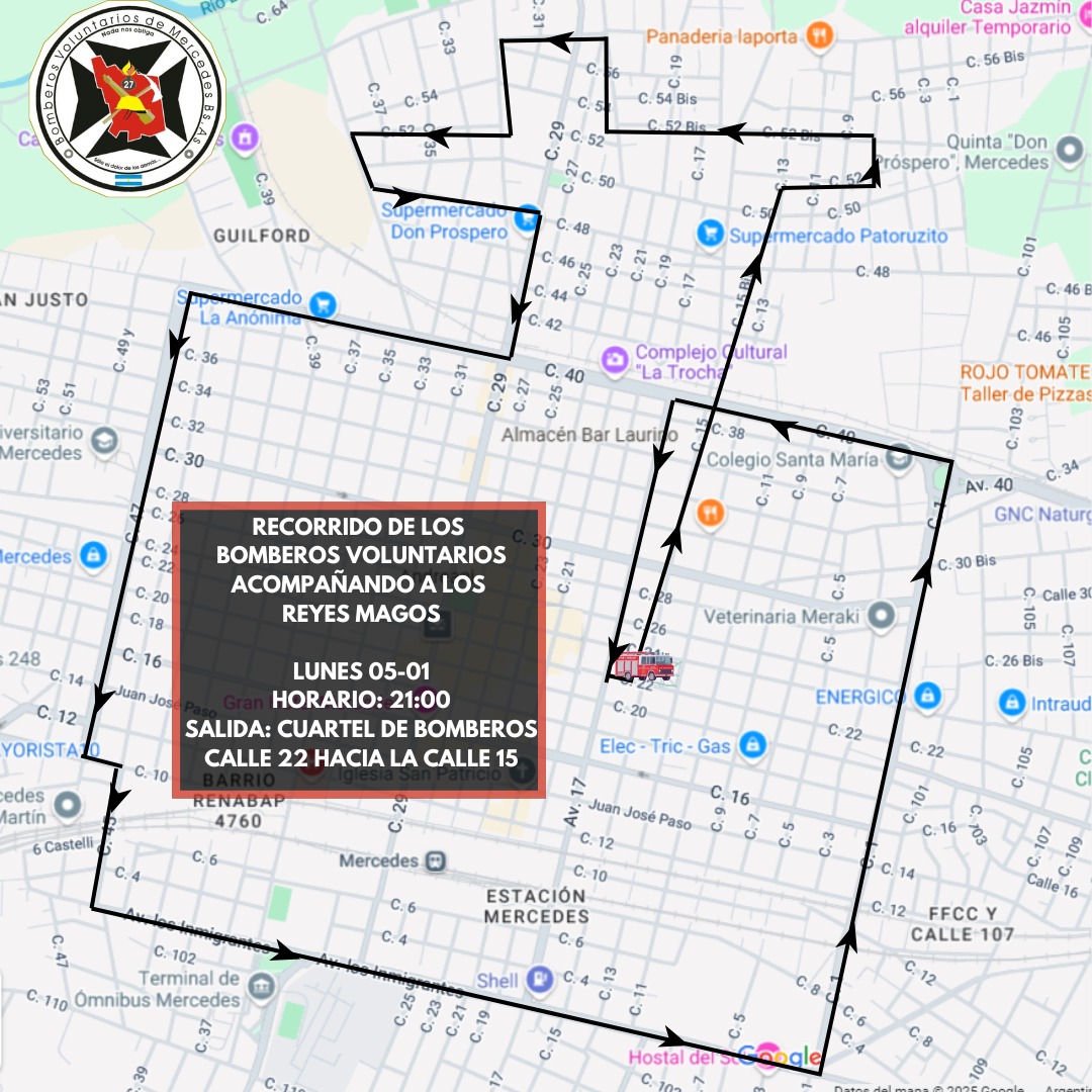El recorrida será de la siguiente manera: Saldrán desde el Cuerpo de Bomberos Voluntarios y por calle 15, irán hasta la 52. De ahí a calle 7 en donde regresarán por la 52 bis. Doblarán por calle 25 a 58 y de allí a 31 bis, retoman la 52 hasta avenida Escolta. Luego, irán por 48 a 29 y a avenida 40. Desde la 40 irán hasta la avenida 47 hasta la calle 10, 45 y tomarán la Avenida de los Inmigrantes derecho hasta la avenida 1. De 1 a 40 nuevamente y volverán al Cuartel por avenida 17, para finalizar la vuelta completa en calle 2 entre 17 y 15.