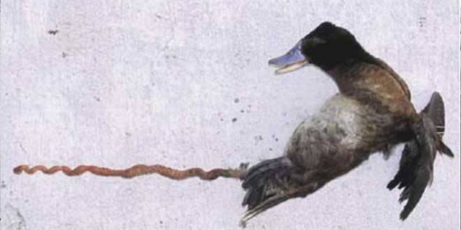 El pato zambullidor argentino (Oxyura Vittata) es el vertebrado con el pene de mayor longitud respecto al cuerpo del planeta. Su pene erecto puede llegar a medir unos 42 cm. casi tanto como el largo de su cuerpo. Es un pato que mide aproximadamente 46 cm. y pesa arriba de los 600 gramos. El pene, que flácido mide aproximadamente 20 cm., es espinoso y tiene la punta en forma de sacacorchos. Esta forma, según los científicos, les sirve para cepillar y retirar del interior de sus parejas cualquier resto seminal de una cópula anterior.
