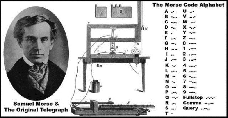 El primer telégrafo de Morse era muy rudimentario. Usaba un caballete, un péndulo, algunas piezas de reloj, y un lápiz. Si no había electricidad, el lápiz dibujaba una línea recta. Si había corriente el péndulo se movía por medio de un imán y el lápiz dibujaba en zigzag. Ya tenía un código binario para transmitir un mensaje.