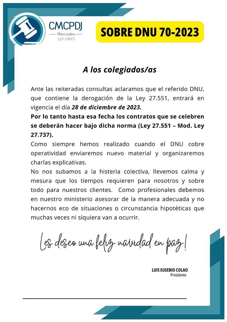 Hace instantes nada más, el Colegio de Martilleros de la ciudad de Mercedes, emitió un comunicado en el que aclara que la derogación de la Ley de Alquileres entrará en vigencia a partir del 28 de diciembre y pidió calma a los profesionales frente a la requisitoria de los mercedinos.