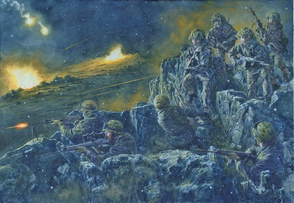Los hombres de la Compañía «B» del RI 6, entre los que se encontraba Balvidares, recibieron la orden de bloquear un flanco para apoyar a la Infantería de Marina. En medio de la oscuridad, apenas iluminada por bengalas y explosiones, comenzó el avance hacia el peligro.