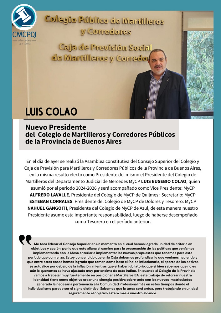 El mercedino Luis Colao es el nuevo presidente del Colegio de Martilleros y Corredores Públicos de la Provincia de Buenos Aires y de la Caja de Profesionales por el período 2024-2026.