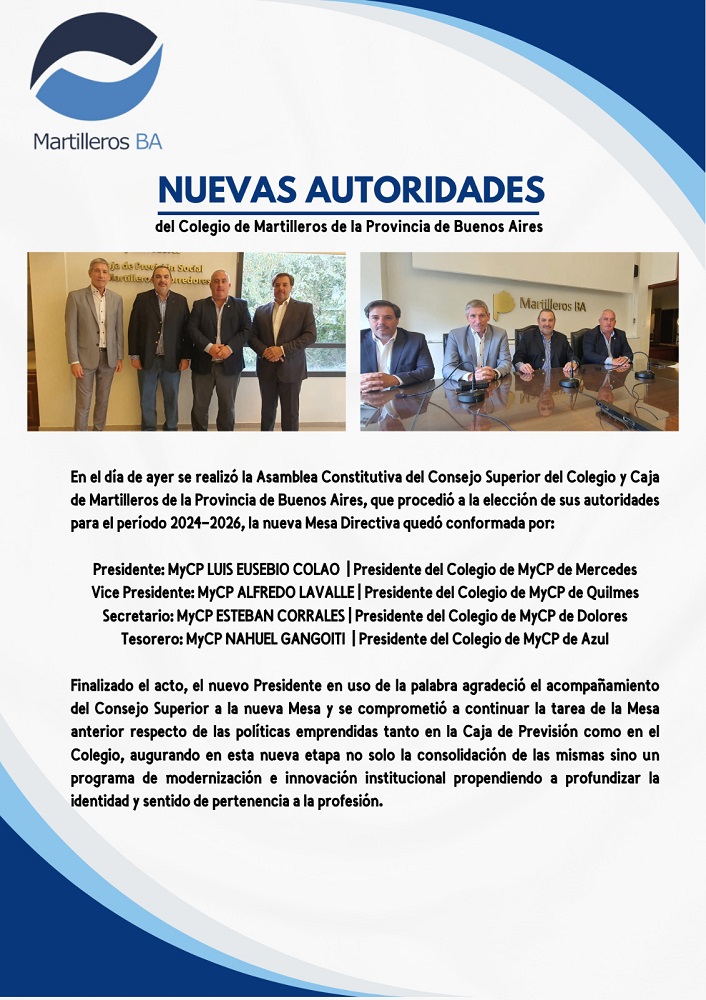 La elección tuvo lugar durante la Asamblea Constitutiva del Consejo Superior del Colegio y Caja de Martilleros de la Provincia de Buenos Aires y la nueva Mesa Directiva estará conformada por: