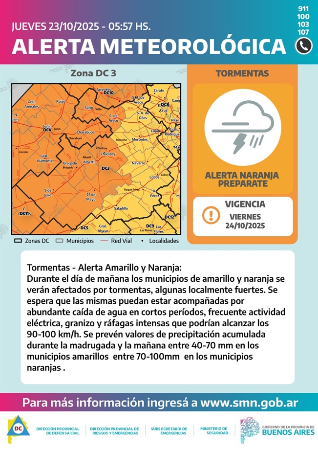 El norte bonaerense vuelve a ser el área más comprometida. Localidades de los partidos de San Nicolás, Pergamino, Colón, Rojas y Junín podrían recibir entre 40 y 70 milímetros, con picos puntuales de hasta 100 mm. El alerta naranja llega hasta Carmen de Areco y Chivilcoy.