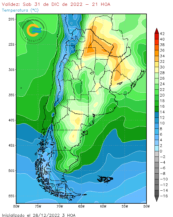 Para el sábado 31 se espera un día caluroso sobre las provincias del norte, con temperaturas máximas entre 33 y 40°C, mientras que sobre la franja central se registrarán temperaturas máximas entre 25 y 32°C. Por el momento, es muy posible que en la mayor parte del centro y norte del país, así como el norte y este de Patagonia, puedan despedir el año con temperaturas cercanas o superiores a los 20°C. En algunos sectores con precipitaciones o en lugares costeros pueden ser inferiores a estos valores.