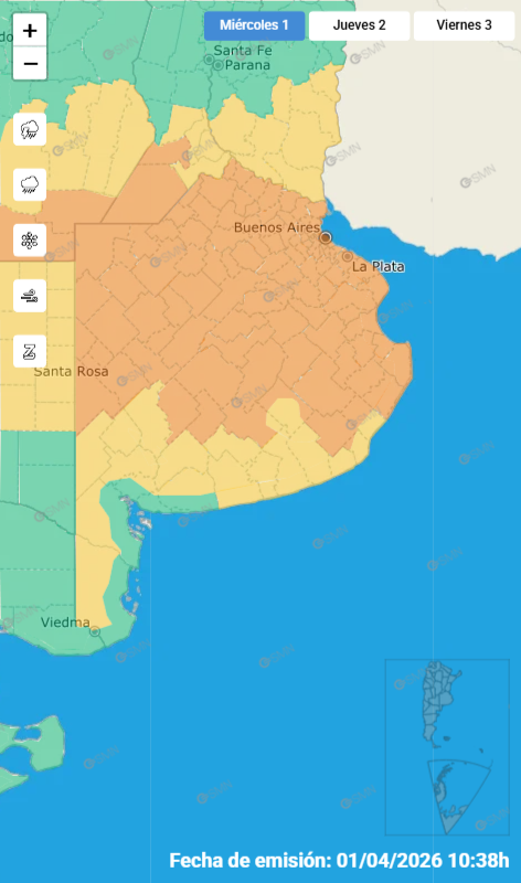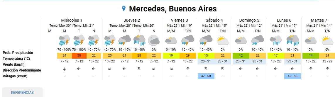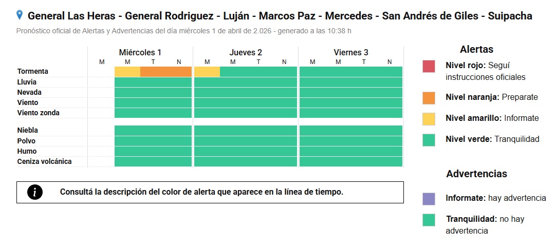 Además de Mercedes, el alerta naranja y los avisos de corto plazo incluyen a localidades vecinas como Luján, Suipacha, San Andrés de Giles, Chivilcoy, Navarro y San Antonio de Areco, extendiéndose también hacia el conurbano y la zona de La Plata. En definitiva, gran parte de la provincia de Buenos Aires.