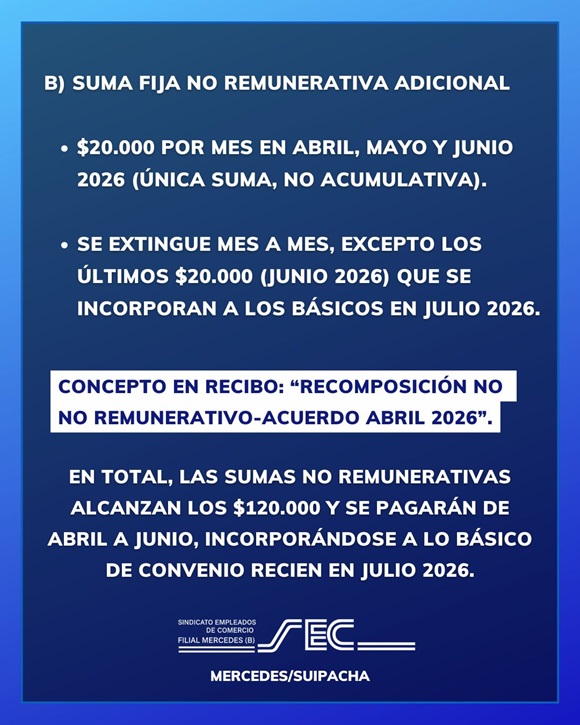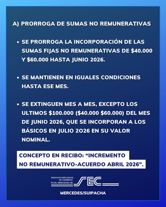 En paralelo, se informó una prórroga en la incorporación de sumas fijas anteriores (de $40.000 y $60.000) a las escalas básicas. Estos montos se mantendrán como no remunerativos hasta junio y recién se sumarán al básico en julio de 2026.