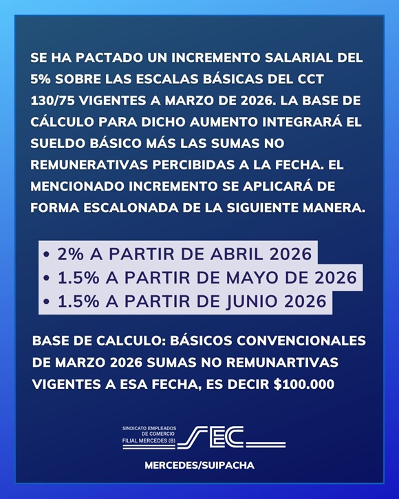 Tras las negociaciones paritarias del sector mercantil, la Federación Argentina de Empleados de Comercio y Servicios (FAECyS) y las principales cámaras del sector (CAC, CAME y UDECA) oficializaron un nuevo esquema de recomposición salarial para los trabajadores comprendidos en el CCT 130/75. La información la dio a conocer el secretario General del Sindicato Empleados de Comercio, Sergio Caballero.