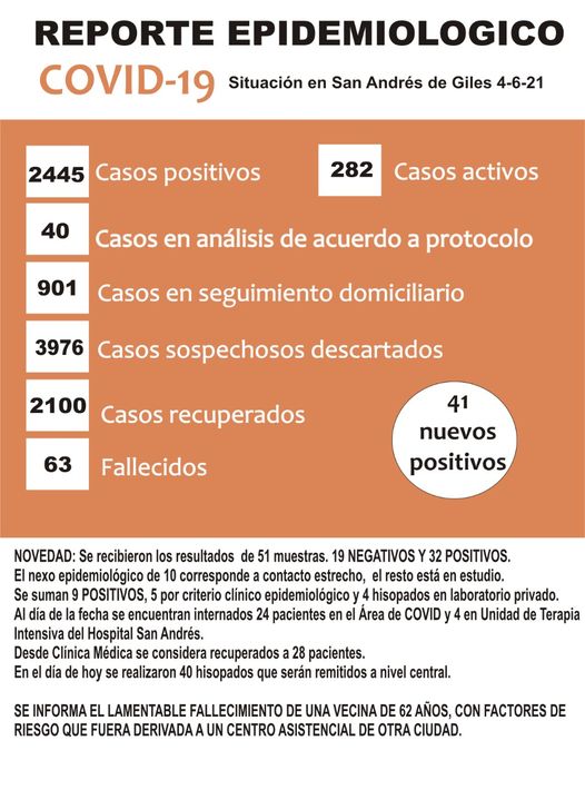 Esta tarde la municipalidad confirmó a través del reporte epidemiológico, el fallecimiento de una vecina de Giles que fue derivada a un efector de salud de otra ciudad. Tenía 62 años y padecía factores de riesgo. Lamentablemente, desde que comenzó la pandemia, nuestra ciudad ya despidió a 63 vecinos que murieron luego de contagiarse.