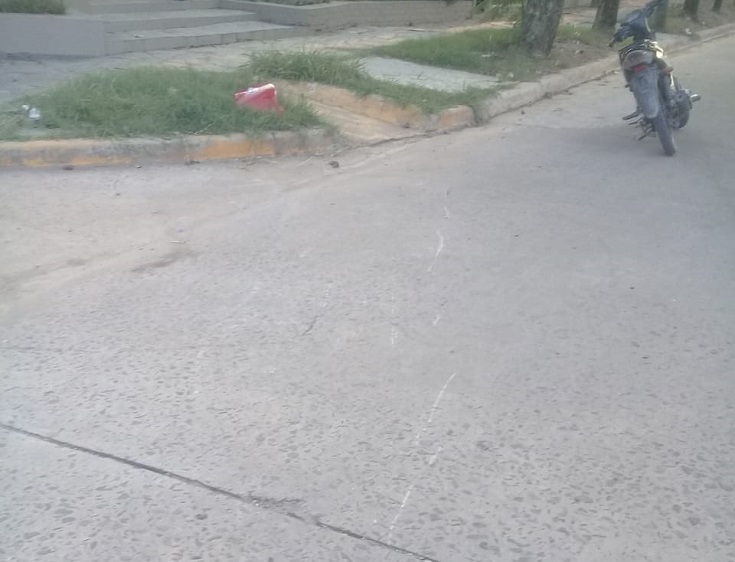 Al llegar a la 34 y 41, fue chocado y dejado tirado en la calle. Creen que ha sido otra moto, por el plástico de moto Gilera que quedó en el lugar, también de color rojo, y también por la frenada que quedó marcada en el pavimento.