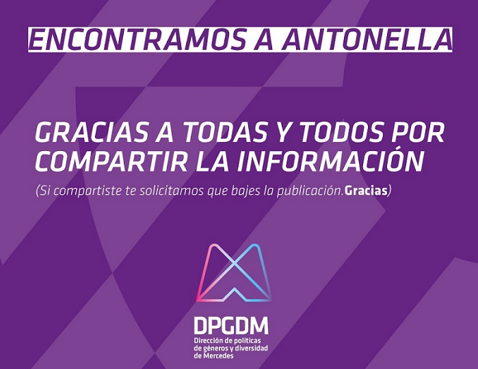 Alrededor de una hora atrás, se encendieron las alarmas en la ciudad de Mercedes movilizándose en la búsqueda de Antonella, que faltaba de su casa desde el viernes pasado.