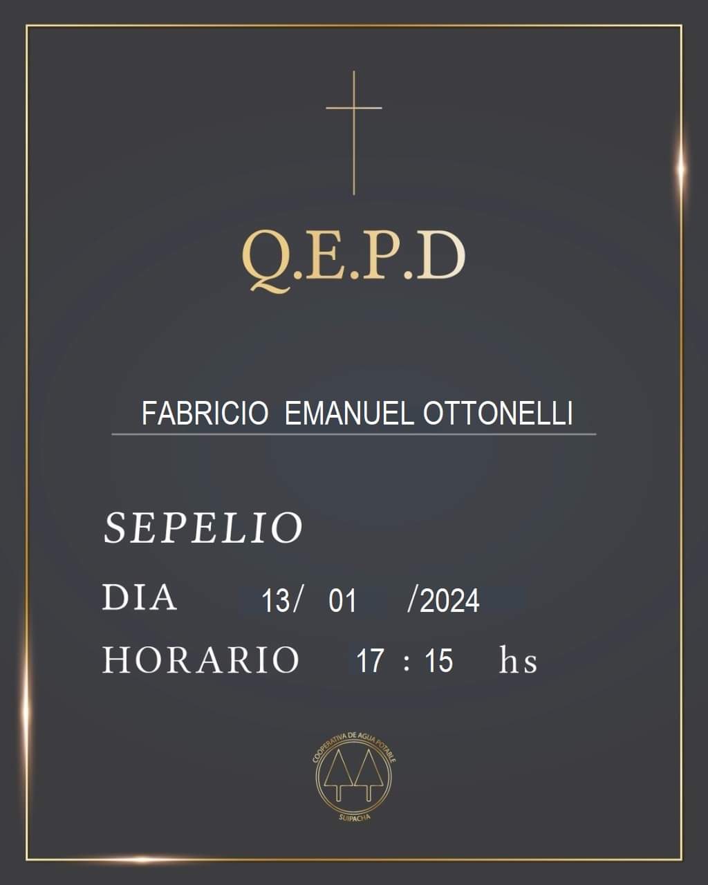 InicioSociedadObituarios Obituarios FABRICIO OTTONELLI Q.E.P.D. By datoposta 13 enero, 2024 0 1863 FacebookTwitterPinterestWhatsApp Falleció el día 12 de enero de 2024 Sepelio: sábado 13, a las 17.15 horas 25 años Suipacha Comparte esto: Comparte en Facebook (Se abre en una ventana nueva) Facebook Compartir en X (Se abre en una ventana nueva) X Me gusta esto:Me gusta Cargando... TagsFABRICIO OTTONELLI Q.E.P.D. Cuota FacebookTwitterPinterestWhatsApp Artículo anteriorMILEI: «PRONTO MIS HIJITOS VENDRÁN A VIVIR CONMIGO A LA QUINTA DE OLIVOS»Artículo siguienteFAMILIAS DISFRUTAN DEL VERANO EN EL CLUB HOLANDA Y SU PILETA datoposta Articulos relacionados Obituarios MARIA ISABEL LEDESMA Q.E.P.D. Sociedad EDEN: NUEVO JEFE DE LAS SUCURSALES MERCEDES Y SAN ANDRES DE GILES Sociedad ENCUENTRO DE COLECTIVIDADES DE MERCEDES Mas leidas Obituarios MARCELINO ALBERTO GOMEZ Q.E.P.D. Obituarios NOEMI MUÑOZ VDA. DE GONZALEZ Q.E.P.D. Gremiales FRENTE DOCENTE CONFIRMÓ PARO TOTAL: NO COMIENZAN LAS CLASES EL 2 DE MARZO DEJA UNA RESPUESTA Cancelar respuesta Comentario: Por favor ingrese su comentario! Nombre:* Por favor ingrese su nombre aquí Correo electrónico:* ¡Has introducido una dirección de correo electrónico incorrecta! Por favor ingrese su dirección de correo electrónico aquí Sitio web: Guardar mi nombre, correo electrónico y sitio web en este navegador la próxima vez que comente. Δ Seguinos4,568FansMe gusta985SeguidoresSeguir512SeguidoresSeguir Ultimos articulos Nacionales HOROSCOPO: COMO SERA SU SEMANA DEL 22 AL 28 DE FEBRERO Deportes FLANDRIA TARDÓ EN REACCIONAR Y CAYÓ DERROTADO EN LA MATANZA Curiosidades CURIOSIDADES DEL 22 DE FEBRERO: DIA DE LA ESTERILIZACION ANIMAL Obituarios MARCELINO ALBERTO GOMEZ Q.E.P.D. Nacionales RECLAMO EN DIPUTADOS POR EL ESTADO DE LA RUTA NACIONAL 5 Y PROVINCIAL 50 Cargar más