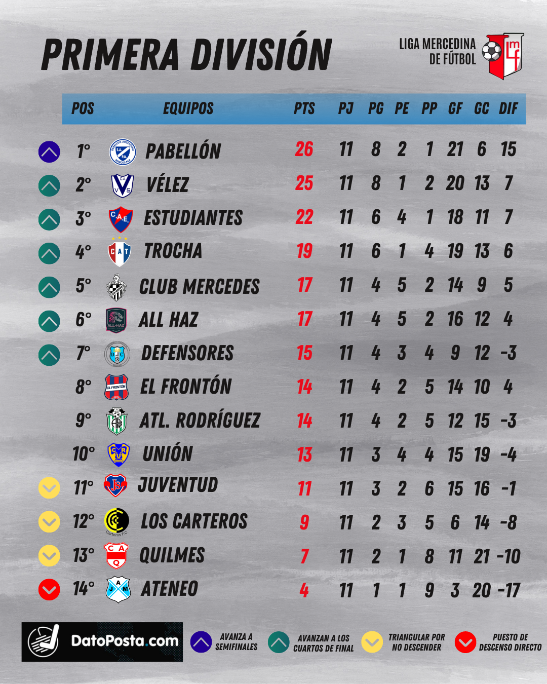 Pasó la fecha 11 del certamen de Primera División de la Liga Mercedina de Fútbol y sólo restan dos jornadas para que se defina todo. Pabellón y Vélez, puntero y escolta, ya tienen un lugar asegurado en el reducido. La zona media tuvo cambios importantes en la tabla y la zona de descensos está al rojo vivo.