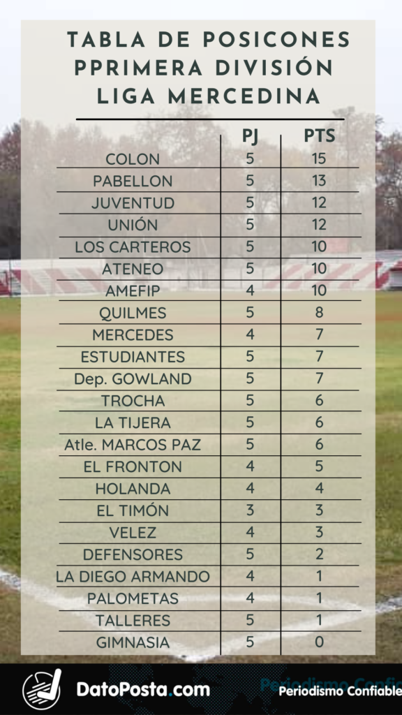 Este tarde se cerró la quinta fecha de la Liga Mercedina de Fútbol con siete encuentros diseminados en el Estadio de la Liga Mercedina, en la cancha de Quilmes y en San Andrés de Giles. Los Carteros y Club Mercedes ganaron y se prenden en la tabla, mientras que Pabellón empató y no pudo igualar la marca del puntero Colón.