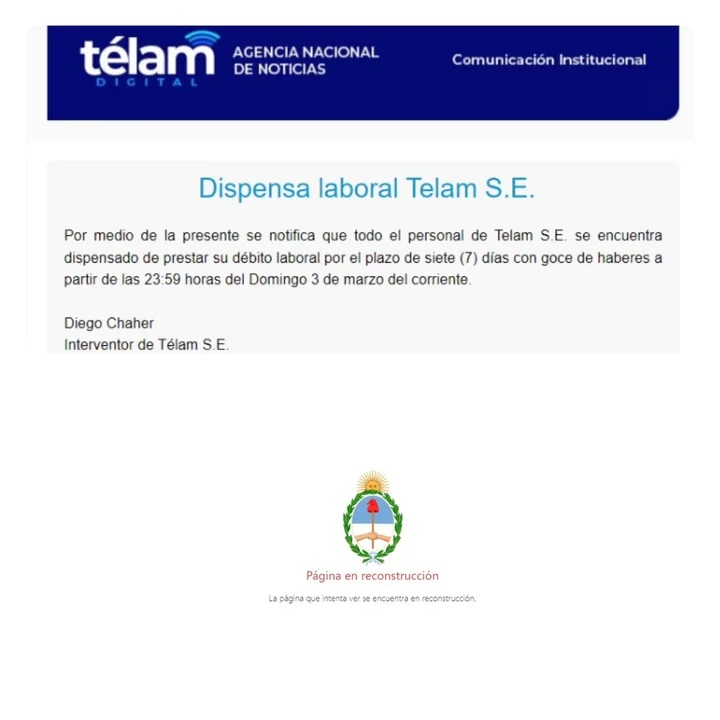 En paralelo, la página web del medio público fue dada de baja y muestra un error con el escudo nacional y la frase: “Página en reconstrucción”. También se les notificó a sus trabajadores vía correo electrónico la licencia